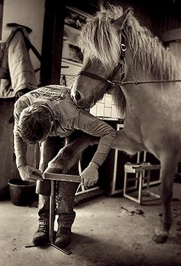 Hij heeft zich gespecialiseerd in hoefbeslag voor gangenpaarden.