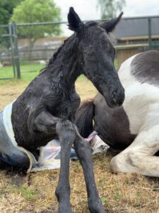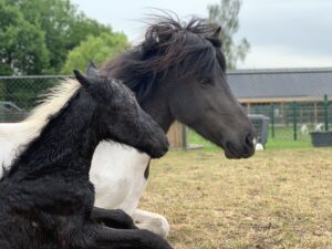 Het tweede veulen is zoals we hoopte ook een merrieveulen. Een prachtige super zwarte merrie die onder toeziend oog van de kinderen overdag geboren werd. Wat ontzettend mooi om weer mee te maken. Dit veulen is vernoemd naar haar over-overgrootmoeder en stammoeder van Foksandi Elska vd Loekshamhoeve. Wie weet een nieuwe stammerrie maar nu eerst maar genieten dat alles gezond is.