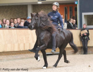 Tijdens het 60-jarig jubileum van het NSIJP wat gevierd werd in combinatie met het fokkerij-event. Mochten Ellen en Óskadis meer rijden in de frá Wyler show daar Óskadis is gefokt door Arnout en Mieke van Herwijnen samen. Na een show onder zadel mochten ze kijken of ze nog steeds zonder zadel en hoofdstel konden rijden. En zoals je kunt zien op de foto konden ze zelfs tölt showen en dit zonder enige training vooraf. Patty wist dit mooie moment van wederzijds vertrouwen vast te leggen.